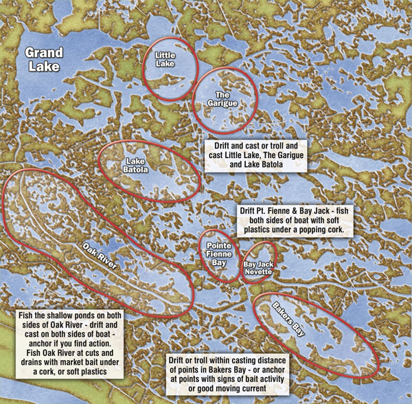 Bucano says his game plan for this month is to fish the shallow lakes and deeper lagoons and ponds by simply drifting across them and casting on both sides of the boat. He also likes to drift or troll within casting distance of the shoreline and work both sides of the boat — the outside for specks, the shoreline for reds.