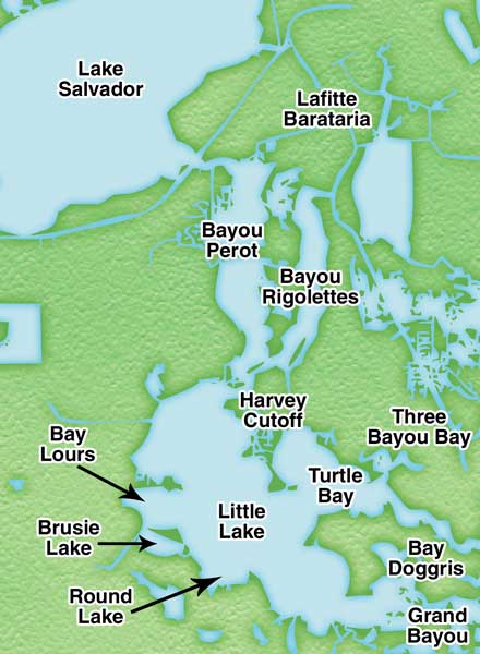 Starting up north, Bush pointed out Lake Salvador, Bayou Perot, Bayou Rigolettes, Little Lake, Bay L’Ours and Plum Point. In fact, Bush explained that had the wind been blowing from the southwest rather than the northwest during our trip, we could have worked the whole bottom shoreline below Plum Point.
