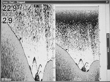 As the water gets shallower most units don’t automatically switch back to a shallower depth range until the bottom indication rises above the middle of the screen. These preset depth range adjustment points keep the unit from driving you crazy by jumping back and forth between two ranges every few seconds, but it also means that the bottom indication stays near the middle of your screen most of the time, wasting half of your screen detail.