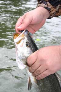 “We caught our trout in three feet of water,” Rodrigue said contributing their shallow location to the fact that the water temperature was 63 degrees. “All our fish came on an LSU ReAction Bayou Chub fished on a lead head jig. There’s something about that bait at DuLarge. If I’ve got a boat full of anglers, and we aren’t getting bit, I let them go through all the bait changes. I know sooner or later they’re going to turn on to that purple and chartreuse minnow.”
