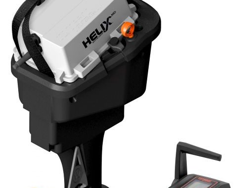The E-Drive uses a bolt-on transom mount, and comes with an electronic binnacle throttle control with a push-button trim/tilt feature, a real-time display with a “fuel gauge” showing the power remaining in the batteries, the remaining motor run time and the current throttle power level setting. A trim gauge is optional.