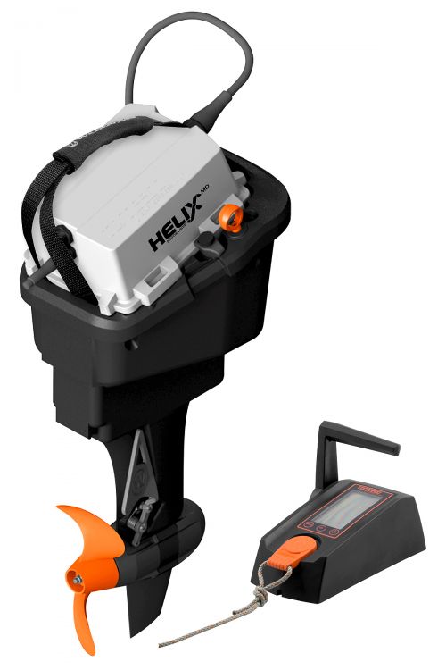 The motor is controlled remotely by an intelligent binnacle throttle with an LCD that shows GPS-calculated speed, remaining range and battery run time