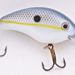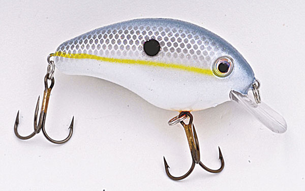 The 4S has an aggressive action, and in June, when the bass return to the river after they’ve finished spawning in the backwaters, they’re hungry and want a bait that runs erratically like the 4S. I only use fluorocarbon line when I’m fishing crankbaits, never monofilament line. Besides chartreuse/black, I like solid pearl, a color that also looks good in dirty water.