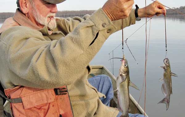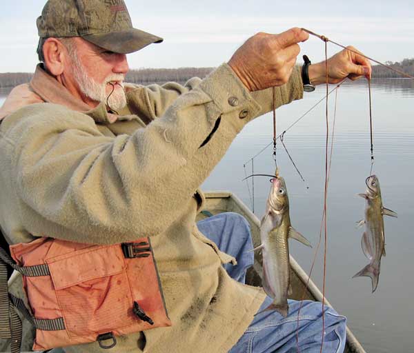 I experienced trotlining for catfish recently with a totally different slant. Roy Dupree, my 60-year-old brother-in-law, takes into account that catfish are bottom feeders, and instead of suspending his lines, he lays the main line as well as the drops onto the muddy lake bottom.