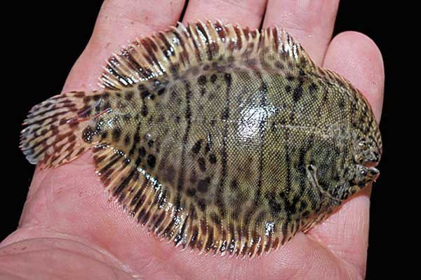 Four families in the Gulf and Atlantic belong to the group of fishes loosely called flatfishes. Smallest is the sole family with only five members. One of these is the hogchoker, so commonly caught in shrimp trawls. These small round fish are best known for being difficult to scrape off flat surfaces such as picking boxes and boat decks. All soles have their eyes on the right side of their heads.