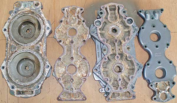 Once the metal is completely cleaned, the surfaces are painted with a thin coat of primer paint to help protect them from salt corrosion, and the engine is reassembled. In order to complete the service of the cooling system, the lower-unit water pump, the thermostats and the pressure relif poppet valve should also be replaced at this time.