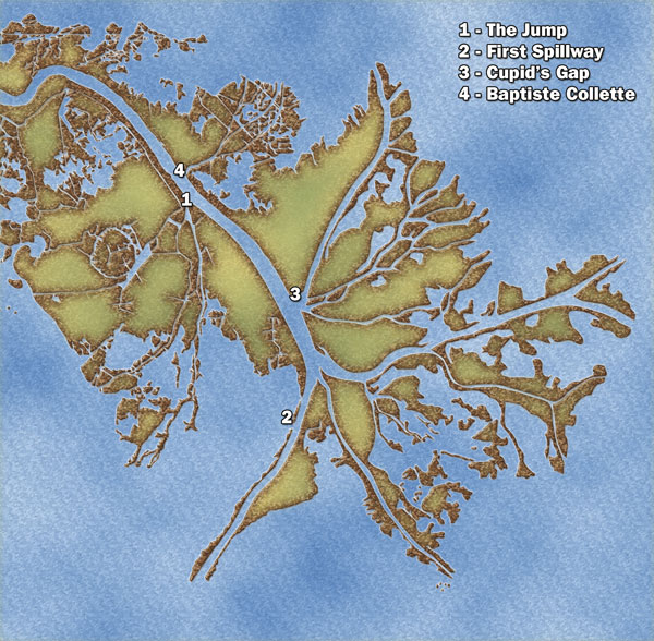 The head of Baptiste Collette is the same kind of situation at Cubit’s Gap. Rather than fish the mouth of the pass where it dumps into a bay, anglers concentrate at the head of the pass where it exits the Mississippi River.