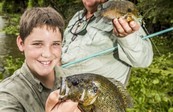 His grandson, 11-year-old Jake Gros, prefers a Salter’s Jig Pole, which allows him to pull the cork all the way to the tip and stick his bait in tight holes or flip a cricket out farther than his grandfather by simply feeding more line.