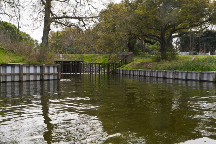 Lighthouse Canal exits the lake on the southern end of the Highway 1 Side. Lake water levels are controlled by three movable 8-foot by 8-foot roller gates set under the highway. The canal itself is only about 75 feet wide.