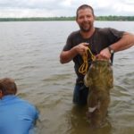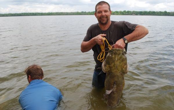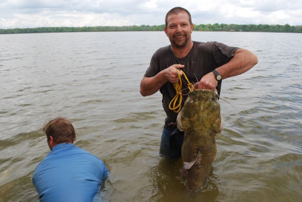 Finally, he burst from the water, hugging a flathead weighing a little over 20 pounds.