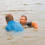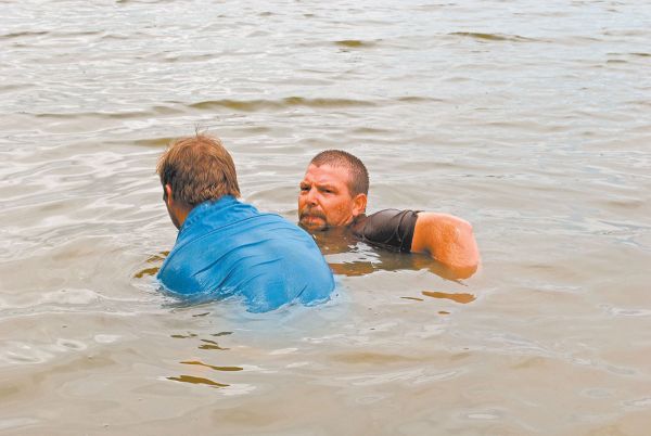 “It’s about 30 or 35 pounds,” Andrews said as he spat water. “The fish is biting the end of the pole.”