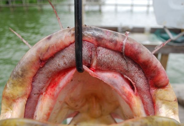 It was about a 20-pound blue cat that was madder than a wet hen. The fish chomped down hard on her hand and started twisting wildly.
