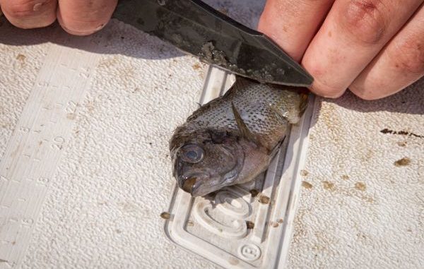 When preparing cut bait, Langlois scrapes the scales off the bream or shad to release a lot of scent and to make it easier for the hook to work. He also cuts through the fish to the backbone in a couple places to release even more tantalizing smell into the water.