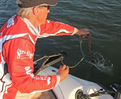 For optimal control, Williams complements his trolling motor’s propulsion with the speed-moderation of a heavy chain dragged behind the boat. Using an electric Minn Kota Deckhand to deploy and retrieve a rope clipped to a 5-foot section of ½-inch chain, Williams adjusts his scope to prevailing conditions: More wind requires more rope to lay more chain on the bottom and increase drag.