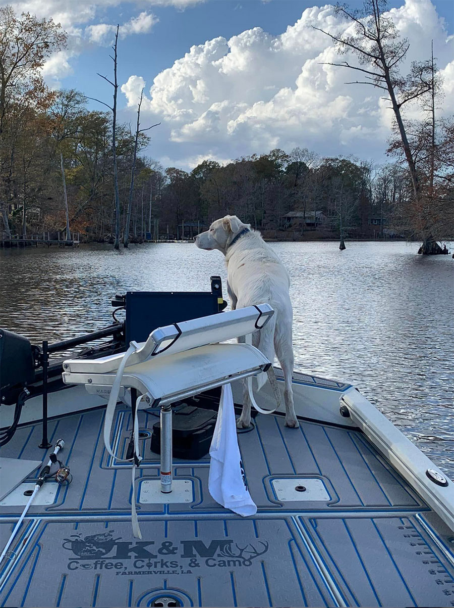 Ghost is usually pretty calm on the water, but when Kavanaugh starts easing over to the D’Arbonne Diner on the lake, Ghost knows lunch is coming and he gets pretty fired up. They would eat there just about every Friday and while Kavanaugh and his friends had their food, the ladies there would fix him a cheeseburger and bring him a bowl of water.