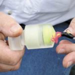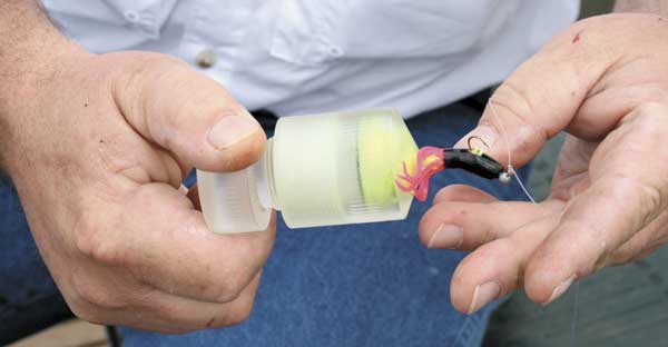I soon found Hulin had a secret weapon that definitely seemed to give him an edge. Some years ago, he invented a simple but ingenious device called the Bait Pump (thebaitpump.com). After filling the small container with crappie nibbles, the nozzle is inserted into a tube jig, and the nibbles can be pumped directly into the bait. It is a much more effective way to use crappie nibbles than simply attaching them to the hook.