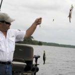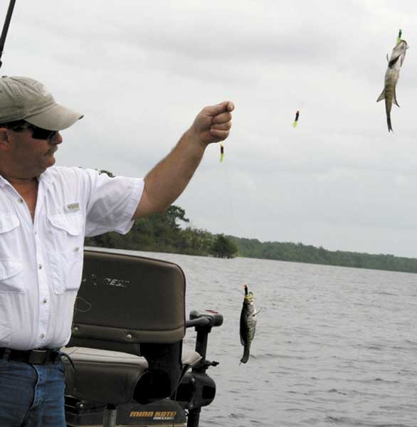 We tried a variety of places and depths, and found everyone was dead-on in predicting good post-flood fishing. Using Hulin’s multi-jig set-up on jigging poles, we probed a submerged stump bed on lower Saline Lake and the deep water in Larto, and eased parallel down the bank line along the channel drop-offs.