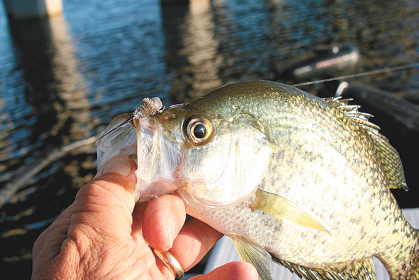 As a result, you need a lighter head to let it drift slowly down. Mathews and Rowell use the smaller 1/16-ounce jig with 8 to 10 feet of line. As they ease along the bridge pilings and cypress trees, they toss the jig out and let it slowly sink.