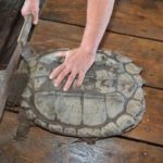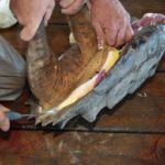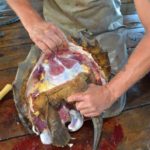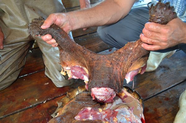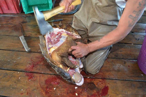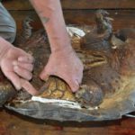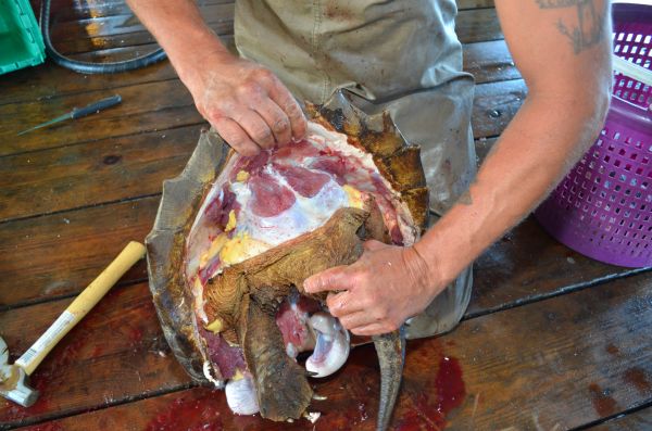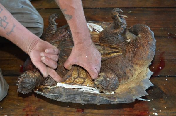 2) Using a hatchet, cut through the isthmus, which connects the belly shell (plastron) with the back shell (carapace). Do this for each side.