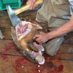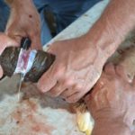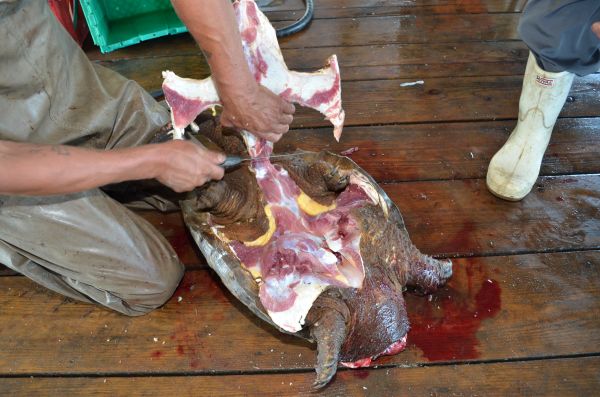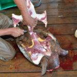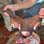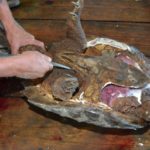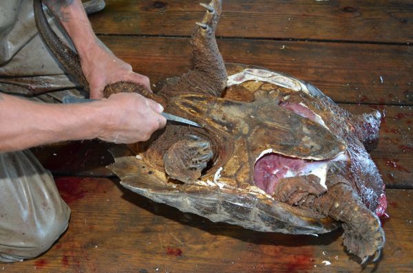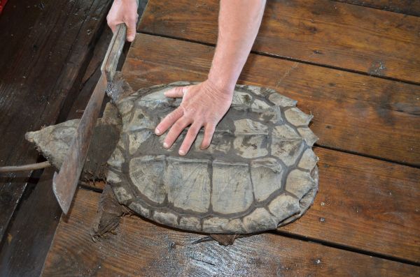 1) With a hatchet or cane knife, cut the turtle’s head off immediately behind its skull so as not to waste any delectable neck meat.