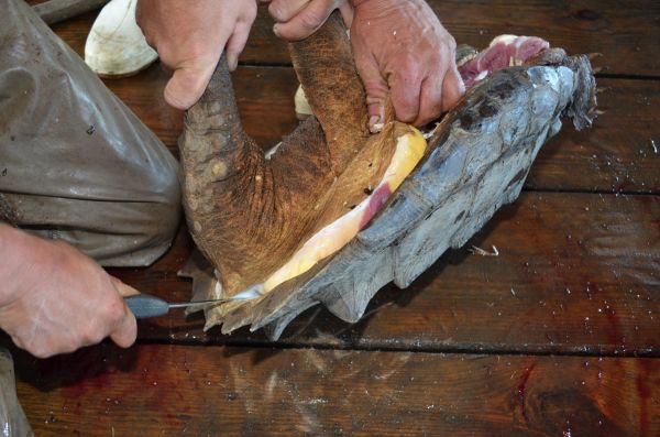 5) Use a knife to cut all parts of skin of the legs, neck and tail loose from the carapace.