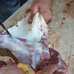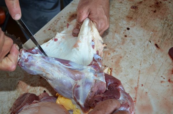 11) Use a knife to carefully cut the skin loose from each leg. Repeat the last three steps for the rear leg and tail unit.