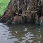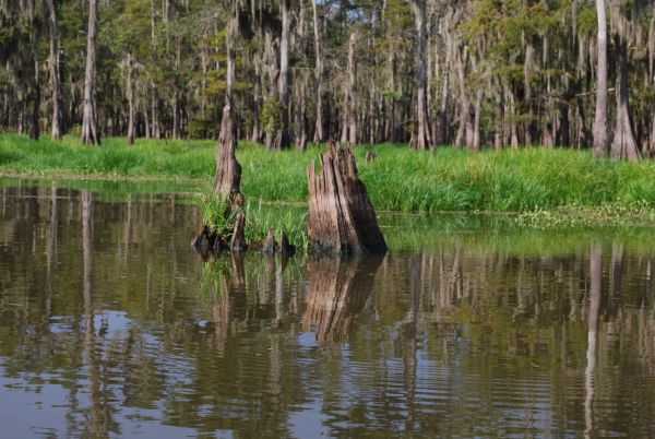 He hung a right into a canal barricaded against large-boat traffic by tall, vertical concrete pilings. The scenic waterway was flanked by huge stumps, the rot-resistant hearts of cypress trees cut long ago during the great cypress lumber boom. The 40-foot second-growth trees now growing in the swamp are mere children compared to the ghosts of the monsters that once dominated this scene.