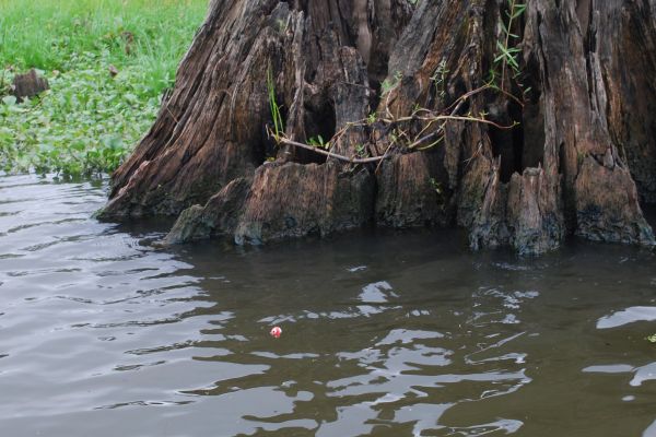 When the Atchafalaya River stops falling during the summer and water flow through the sloughs stops, concentrations of goggle-eyes at slough mouths break up and the fish disperse to begin holding on logs, stumps and tree limb stick-ups.