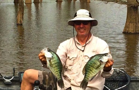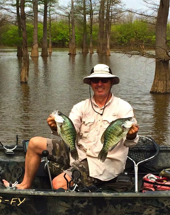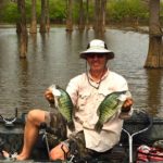 First, put in and ride the bayou for a bit. Find some stump lines and pick some that look good to you. The bayou isn’t real wide in most areas and in the summertime. There are lots of stump rows along the edge of the channel near the bank. There is almost always one side of the bayou that is in the shade. Jim likes to fish those areas, and the fish seem to like them, too. He normally fishes pretty shallow in the summer, usually catching fish suspended 2-4 feet deep. He recommends fishing slowly and making sure you drop the jig on both sides of the stump.