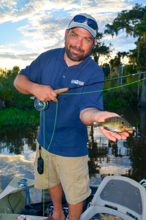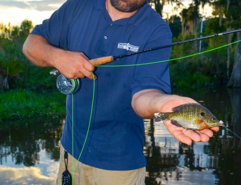 He uses 10-pound test fluorocarbon leaders because of where he fishes, allowing him to yank the fly out of the bayou’s lush growth of trees and grass when it hangs he misses his target. Most people use 2- or 4-pound test lines for bream fishing, he noted.