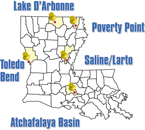 “If the weather’s warm in February, the crappie will be moving closer to the beds, and you should be able to catch them in 6 inches to 2 feet of water at the Saline-Larto complex,” he said. “At Toledo Bend, the crappie will be in grass beds 10- to 14-feet deep, after coming out of 30 feet of water and moving closer to their spawning areas. The spawn’s a little later at Toledo Bend than it is at Saline-Larto.”