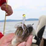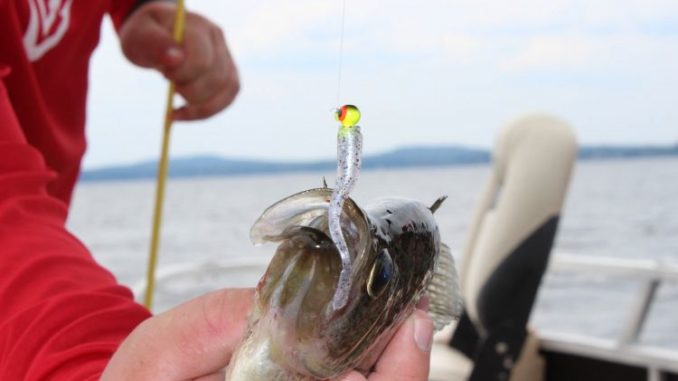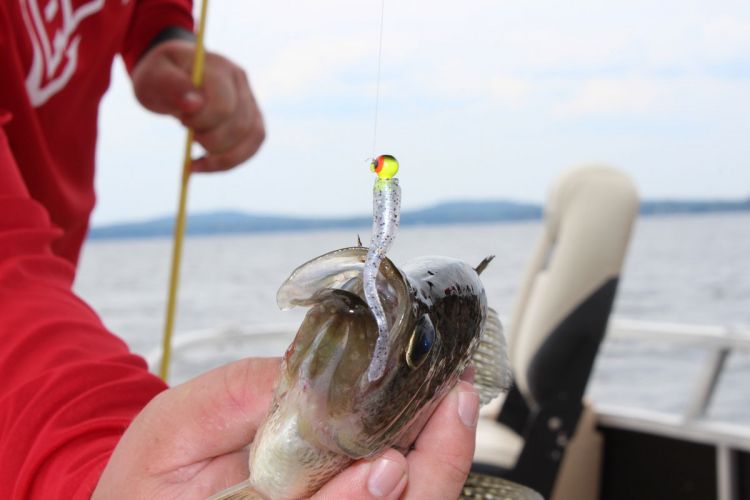 Dubois prefers to fish it on a 1/32-ounce or 1/16-ounce Jenny’s Jig leadhead. If he uses the 1/32-ounce model he crimps a small BB shot about 8 inches above the leadhead.