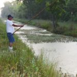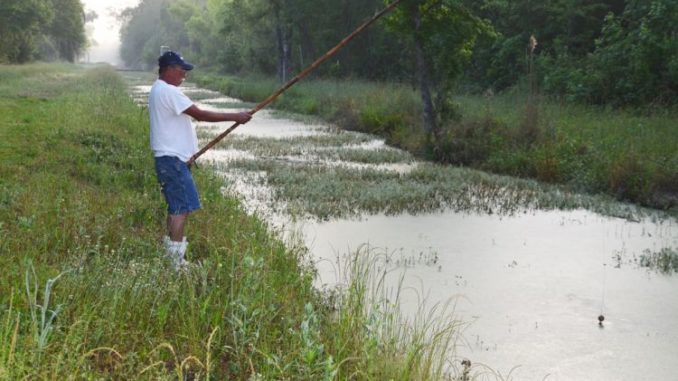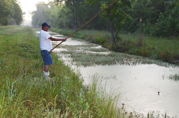 While cane poles and corks are used, choupique fishing is not a passive affair. The men worked actively to attract the fish to their baits. One technique involved dabbling their big corks up and down on the water’s surface, then allowing them to rest still for a few seconds to look for a bite.