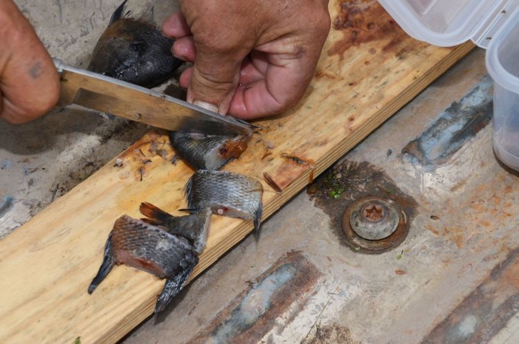 But the Lirettes were confident. Before unlimbering their poles (they carried five to have three extras), one cut bream caught the day before on small hooks into bait-sized pieces and the other sorted through the bait crawfish bucket, discarding the dead ones.