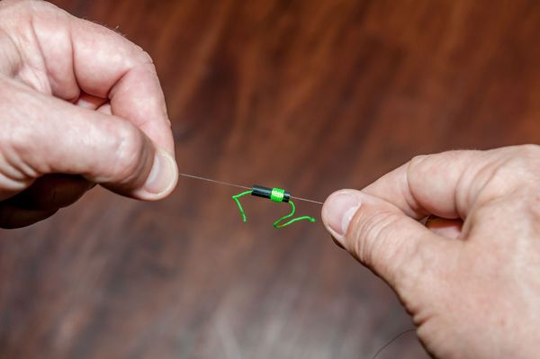 1) Slide your line through the bobber stopper’s plastic tubing, leaving plenty of tag line with which to work.