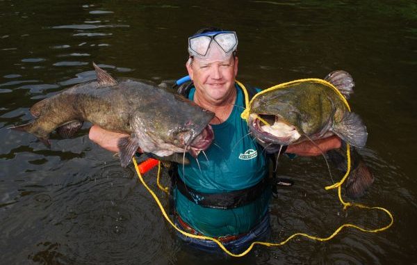 Each diver is shod with tennis or dive shoes, and they wear stainless steel fillet gloves, both to protect their hands from rough metal on the tank and from a catfish’s sandpaper-like tooth pads.