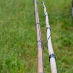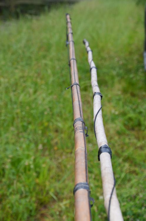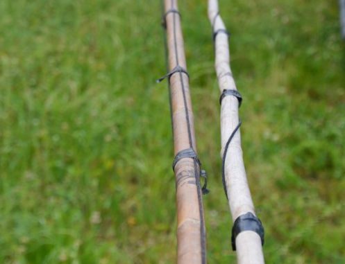 The latter length of twine (running from the tip of the pole to its butt) is taped to the pole every 18 to 24 inches with electrical tape. The knots on the tip and butt are also taped over.