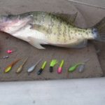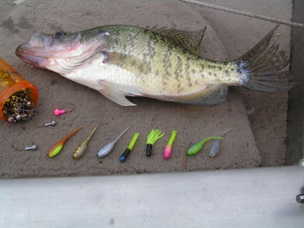 Weldon fishes shiners more in the summer than he does jigs, but when he does turn to artificials, he offers fish small, pink-headed jigs with blue thunder or electric chicken plastic trailers.