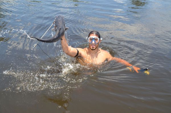 The thought of a huge catfish on the other end of a spear gun hauling me through tree stumps made me cringe. I asked him what he would do if he saw a 100-pounder.