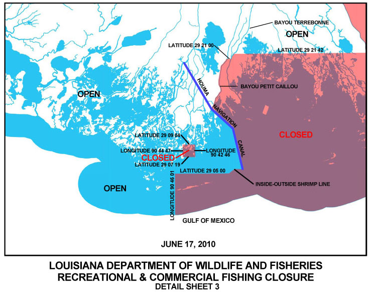 Also opened were inshore waters between 29 degrees, 08 minutes, 19 seconds north latitude from the Houma Canal red buoy line west to 90 degrees 39 minutes, 26.8 seconds west latitude.