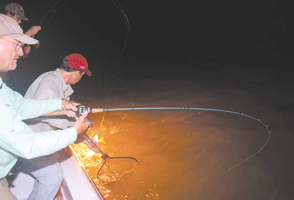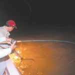 As the sun began to slip below the horizon, the water was still snorting out of the pass and the wind hadn’t abated, but they were determined to fish into the night. Carefully, they unpacked two large sodium-vapor lights and mounted them on the gunnels of the boat.