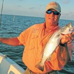 “Don’t let your boat get back into the breaking waves where it could be turned over,” he cautioned. “You want to anchor so you can cast to right where the waves are starting to break. Toss a live croaker Carolina-rigged or a live shrimp under a cork right there, especially on a falling tide, and you’ll catch some very nice trout.”