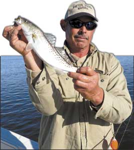 We tossed live baits and Deadly Dudley Shrimp Maulers, and let our baits flow with the current. Once the baits moved off the shallow flats and dropped into a few feet of water, the trout were there, waiting in ambush.
