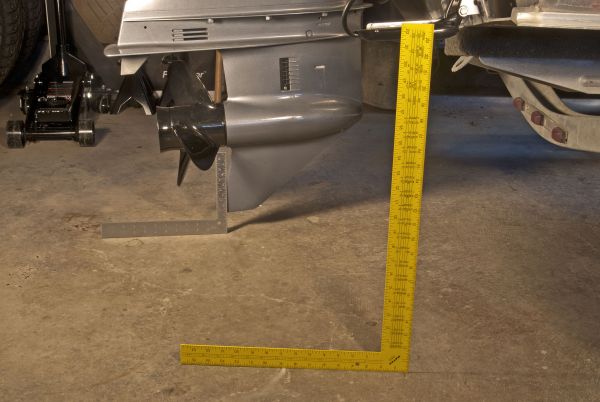 It’s easy enough to figure out. Load your boat on its trailer and park it on a flat, level surface. Chock the trailer’s wheels and disconnect the trailer from your tow vehicle. Raise or lower your dolly jack at the front of the trailer until your boat sits at the same angle that it settles into in the water when it is at rest or moving at a slow walking speed. Next, tilt the engine’s drive unit as far down as you can without its skeg touching the ground. Hopefully you will be able to lower it all the way down. With a tape measure or yard stick, measure the distance between the bottom of the transducer and the ground and then measure the distance between the bottom of your drive unit’s skeg and the ground. Subtract the skeg’s distance from the ground from the transducer’s distance from the ground and the remainder will tell you how far below your transducer the skeg reaches.