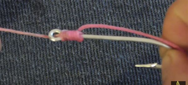 • Pass the line through the eye of the hook, ensuring that it’s going from the point side of the eye to back of the hook.