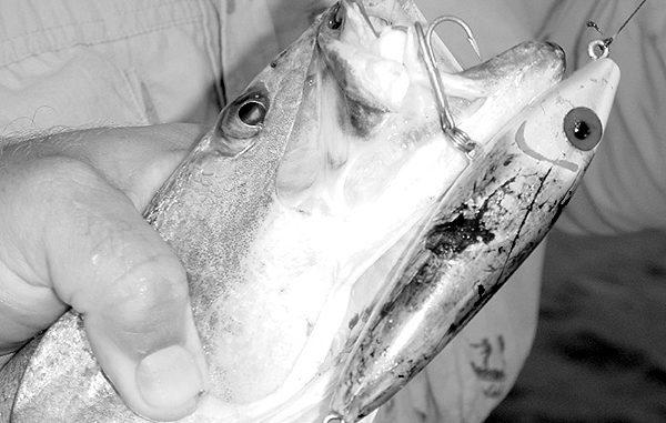 For guides like Taylor, many charters preclude the use of topwater plugs with their flying treble hooks. The need for discipline in hooking fish on these baits understandably escapes many beginners, forcing the application of alternatives when fish show a preference for floating hard plastic.