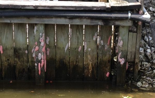 The giant apple snail, about which the rest of this discussion will be confined, is now common in many South Louisiana waterways, especially canals. Its presence is usually first noticed when the masses of hot-pink eggs lays appear on anything that sticks out of the water.