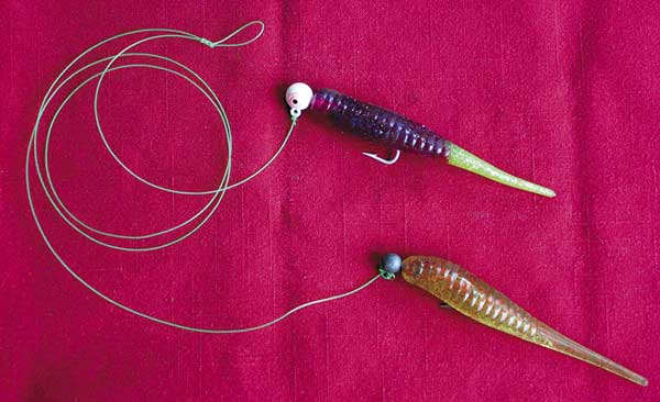 To compensate, Womack uses a double hook set-up with a 1/2-ounce jig head on the bottom and a 1/4-ounce jig on top, both with 4-inch plastic H&H Cocahoes, Deadly Dudleys or Stanley Wedge Tail saltwater baits.
