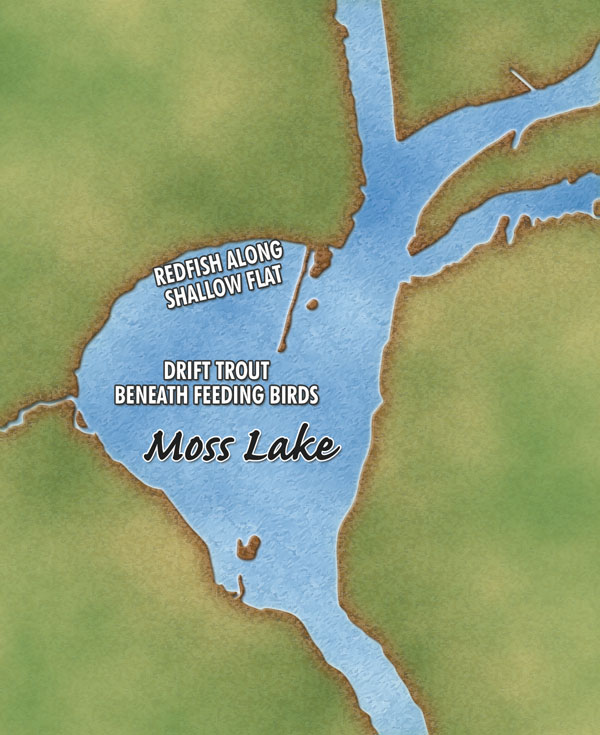 Of course, schooling trout are easy to catch. But when the birds aren’t working, it’s a matter of working the ledge where the shallow southern bank falls into the channel.