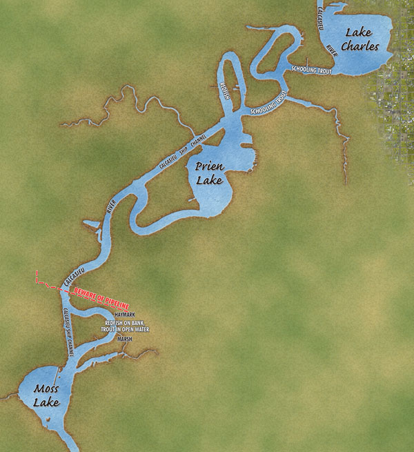 As with Prien, Lake Charles and Moss Lake are pretty small. But they hold reds and trout throughout the year — and all three diminutive lakes are located along a 10½-mile stretch of the Calcasieu River, making them perfect for small-boat anglers like Medicis.